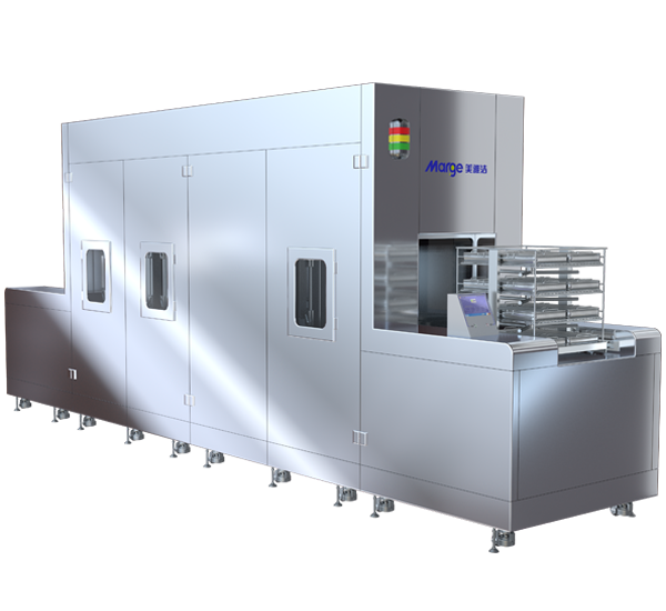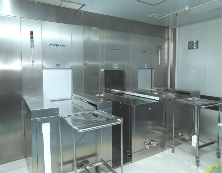 3、四艙真空多艙處理工藝:噴淋預清洗→真空超聲波加酶清洗→真空沸騰加酶清洗→噴淋漂洗→熱水噴淋消毒→凈熱風循環(huán)干燥